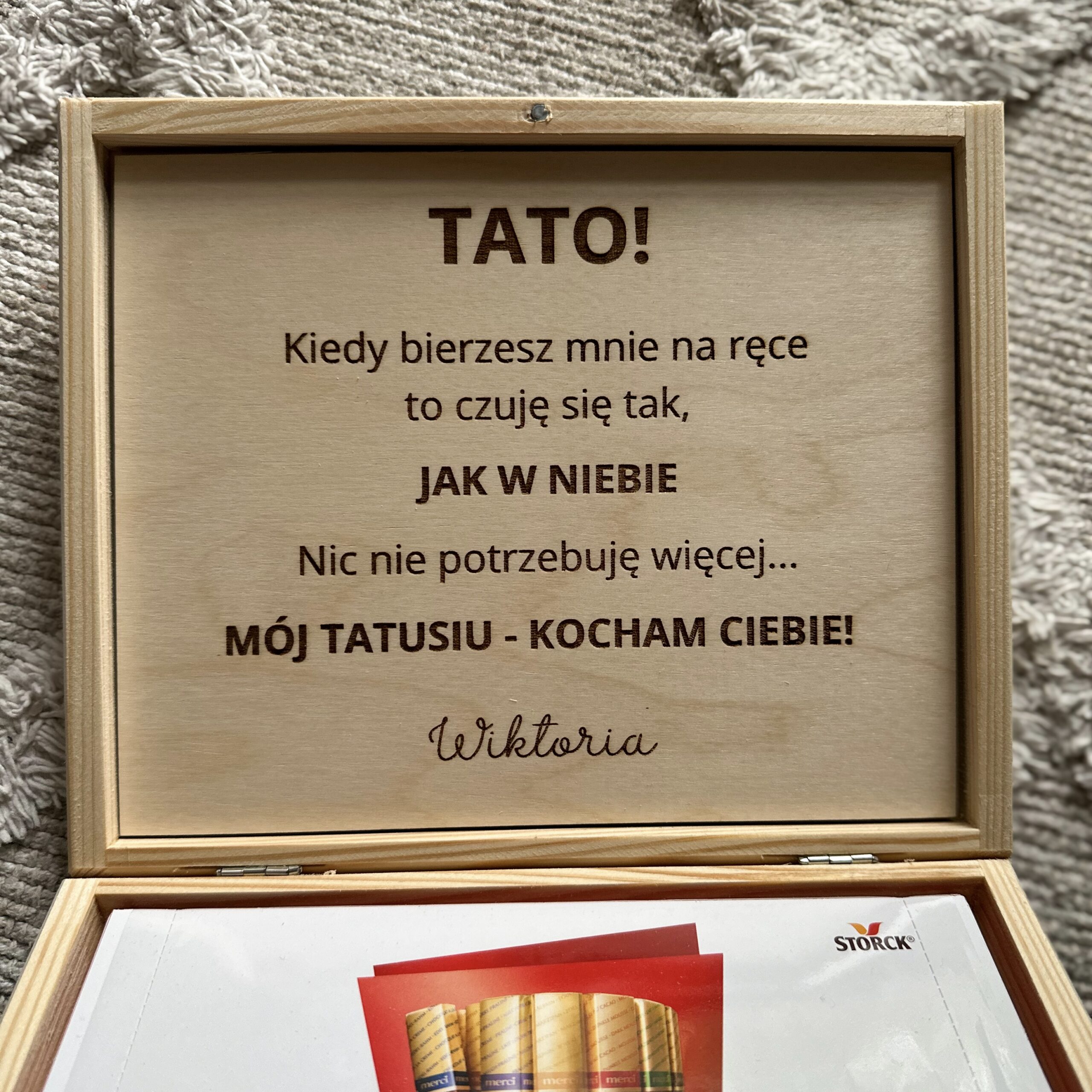 Pudełko z zewnątrz oraz wewnątrz posiada spersonalizowany grawer – życzenia i podpis.